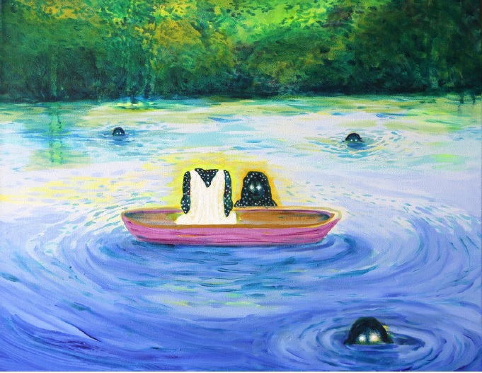 This painting shows a boat in which a headless woman with night-colored skin and starry freckles rests. Her head is lying next to her in the boat. Three heads emerge from the water, resembling the woman in the boat with bright eyes. They are in a body of water that vibrates due to the presence of this magical woman, surrounded by a natural environment and lush foliage.