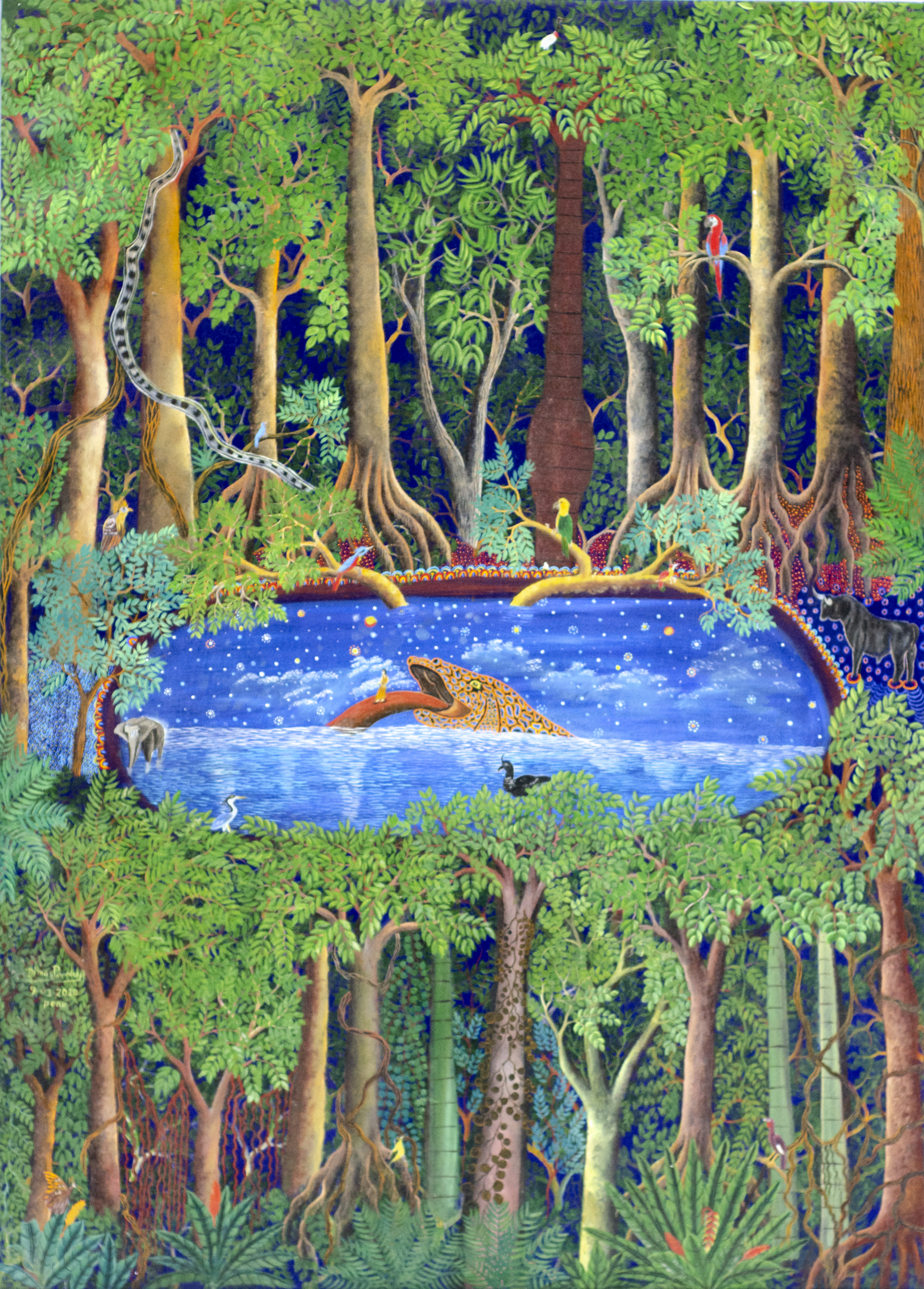 This painting presents a magical realist scene set in the heart of the Amazon. At the center of the artwork, there is an enigmatic forbidden lake. Its surface reflects a starry sky, creating a visual fusion between the earthly and the celestial realms. The lake is surrounded by lush vegetation, with tall trees and majestic palm trees leaning toward the water in reverence to the region’s natural beauty. In the center of the lake emerges a fish of mythical proportions. Its body is adorned with intricate patterns reminiscent of Indigenous tribal designs. What is most astonishing is its long, serpentine tongue extending towards the night sky as if reaching out to touch the stars. This image evokes the beliefs and cosmologies of the region’s Indigenous people, where animals and nature are infused with deep spiritual significance.