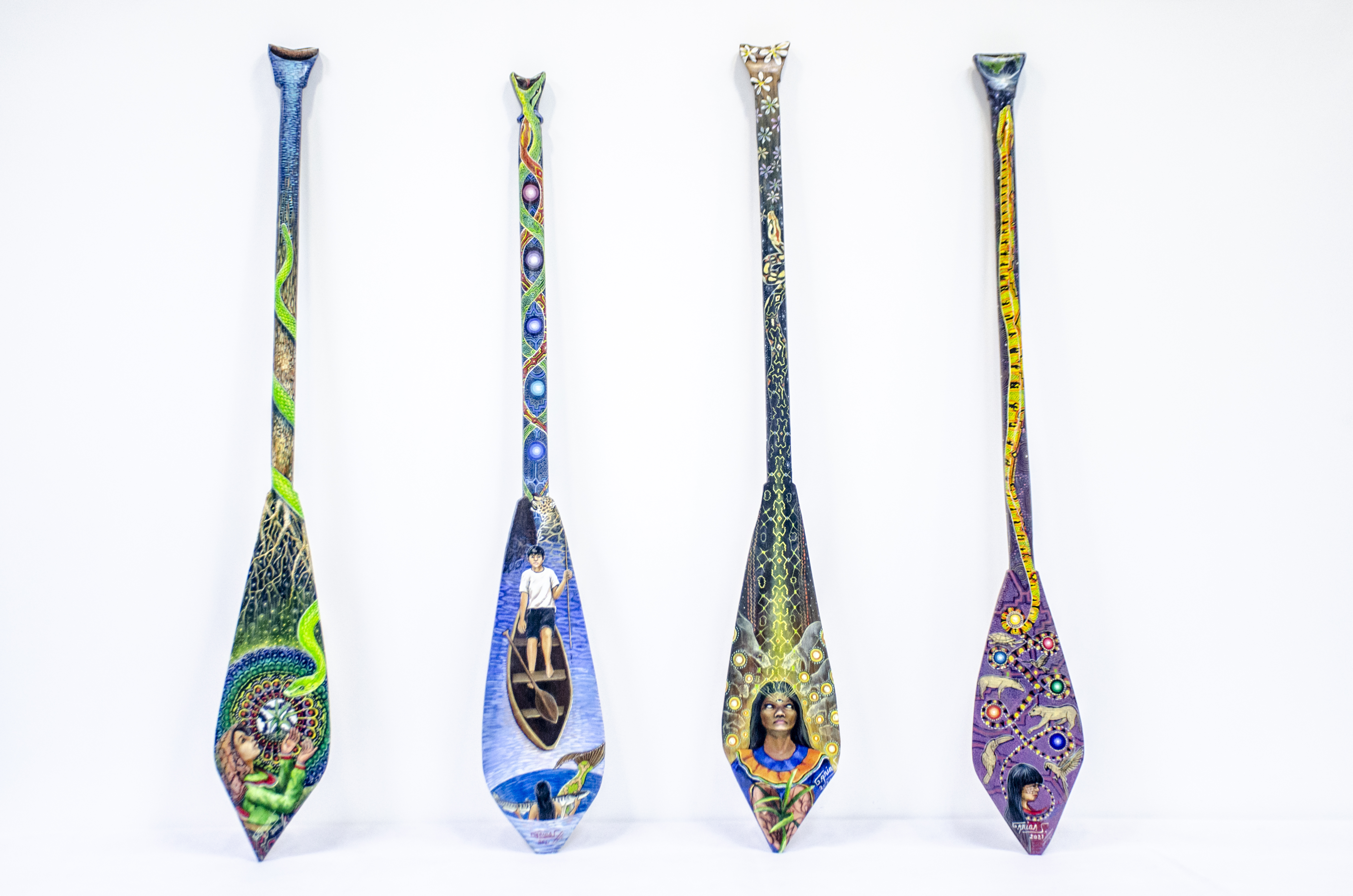 This artwork is a captivating visual representation that combines everyday items like machetes and oars with the rich Amazonian mythology and symbols of nature. The artist has transformed these utilitarian objects into canvases to tell stories and convey deep cultural and spiritual connections.