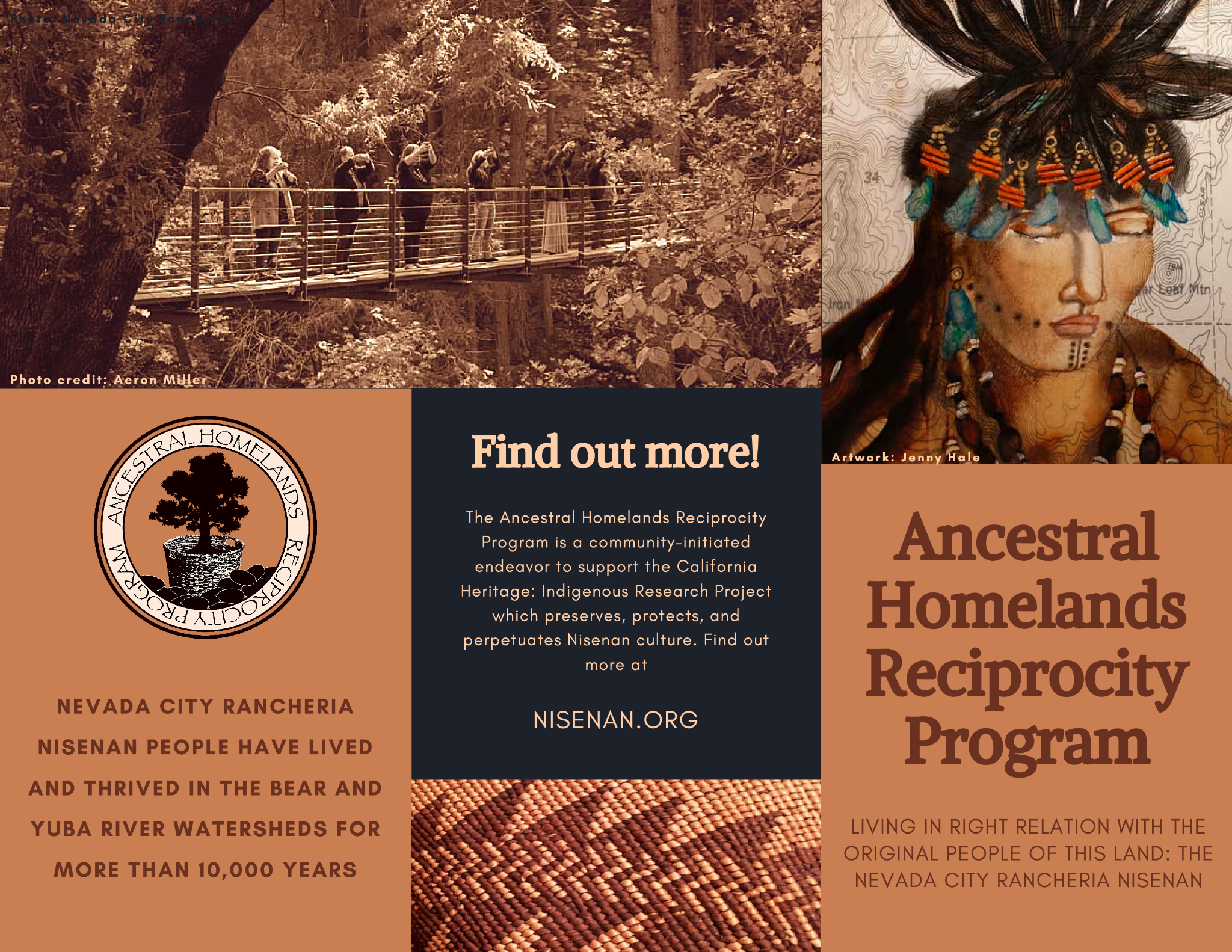 Ancestral Homelands Reciprocity Program brochure. More information available at NISENAN.ORG. Courtesy of the Nevada City Rancheria Nisenan Tribe. Artwork by Jenny Hale; Photography by Nevada City Rancheria, Aeron Miller, Craig Silberman, and Ember Amador.