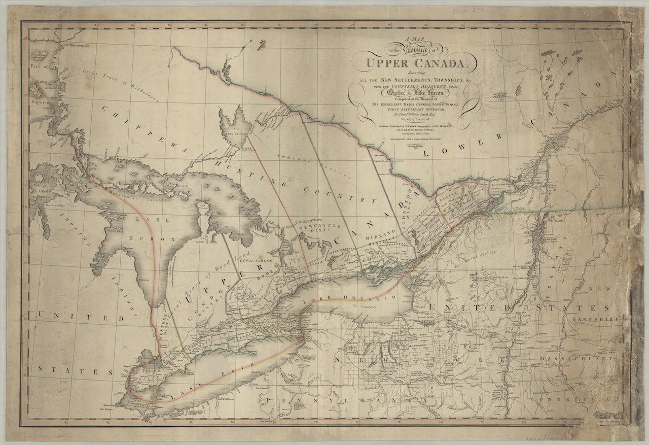 Smyth, David William. A map of the province of Upper Canada, describing all the new settlements, townships, &c.: with the countries adjacent, from Quebec to Lake Huron. London: Printed by William Faden, 1813 [orig. pub. 12 April 1800]. McMaster University: Hodsoll Collection Digital Archive, McMaster University, Hamilton, Ontario, Canada.