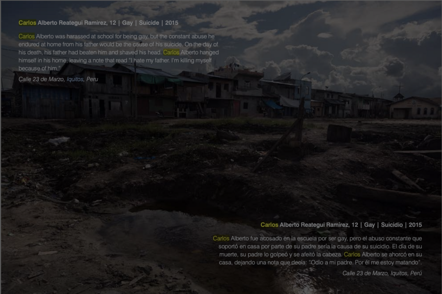Carlos Alberto Reategui Ramirez, 12 | Gay | Suicidio | 2015 Carlos Alberto era acosado en la escuela por ser gay, pero el abuso constante que sufría en casa por parte de su padre fue la causa de su suicidio. El día de su muerte, su padre lo había golpeado y le había rapado la cabeza. Carlos Alberto se ahorcó en su casa, dejando una nota que decía: “Odio a mi padre. Me mato por su culpa.” Calle 23 de Marzo, Iquitos, Peru"