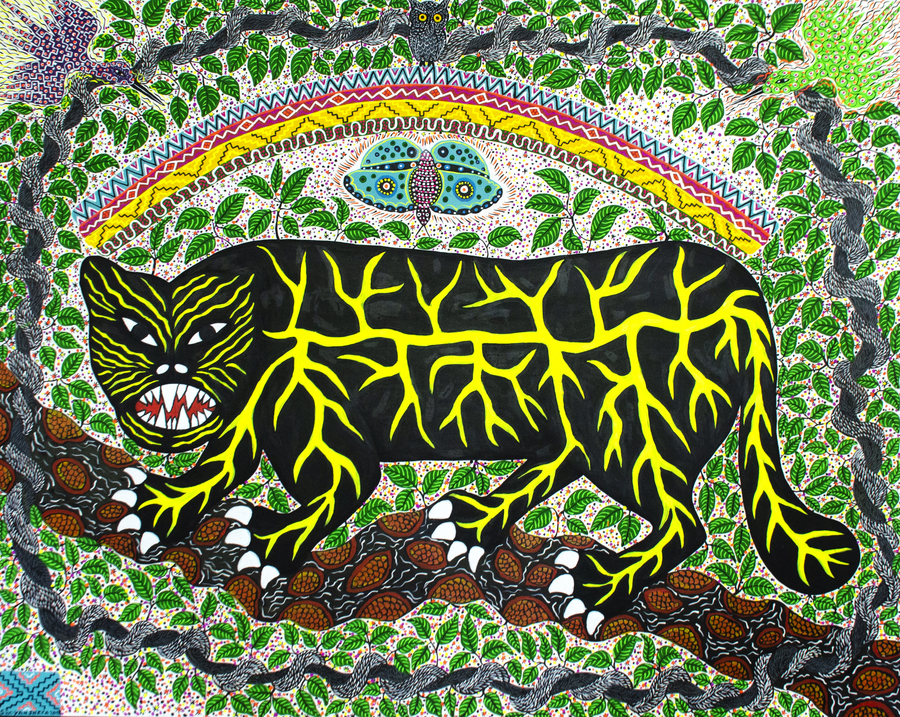 Esta pintura de acrílico en lienzo se enfoca en el jaguar, un felino poderoso y espiritual que ocupa el espacio central de la composición. Su cuerpo está decorado con marcas que, a primera vista, evocan las formas de las raíces y ramas de la selva, estableciendo un cautivador diálogo visual con sus alrededores naturales. El jaguar es un símbolo de gran significado en la cosmovisión Shipibo, con cualidades atribuidas como la fuerza, agilidad y protección. Además del jaguar, la obra incopora la figura de una mariposa, un elemento que simboliza la transformación y metamorfosis en la cultura Shipibo. Esta criatura alada representa el viaje del alma y la transición entra las diferentes etapas de la vida. Adicionalmente, la pintura incluye la imagen de un arcoiris, un símbolo de esperanza y balance en la cosmovisión Shipibo. El arcoiris actúa como un punete entre las dimensiones espirituales y terrenales, transmitiendo un mensaje de gran importancia.
