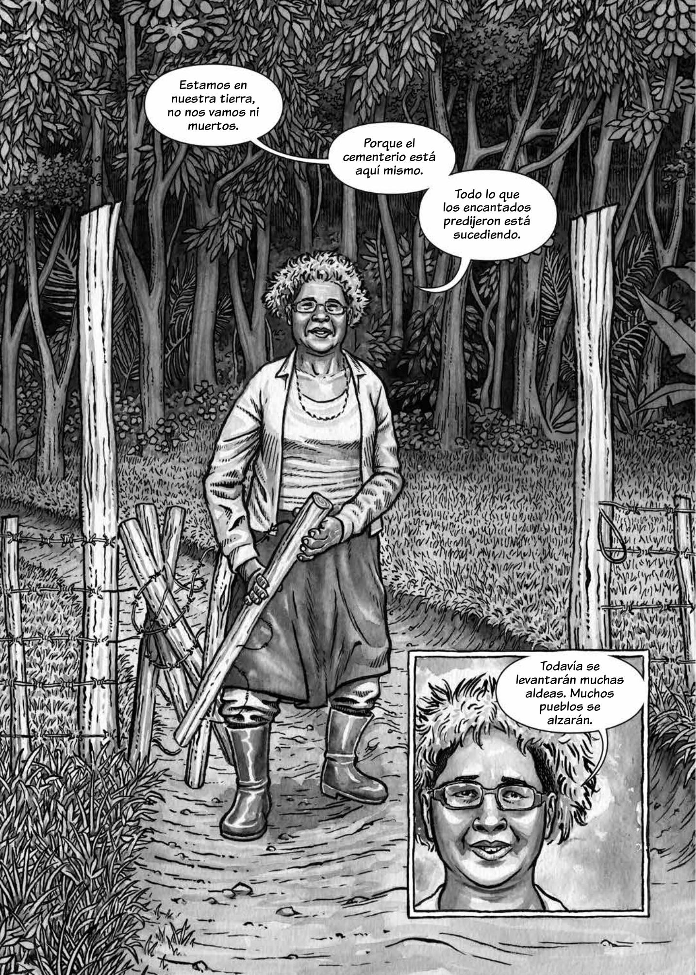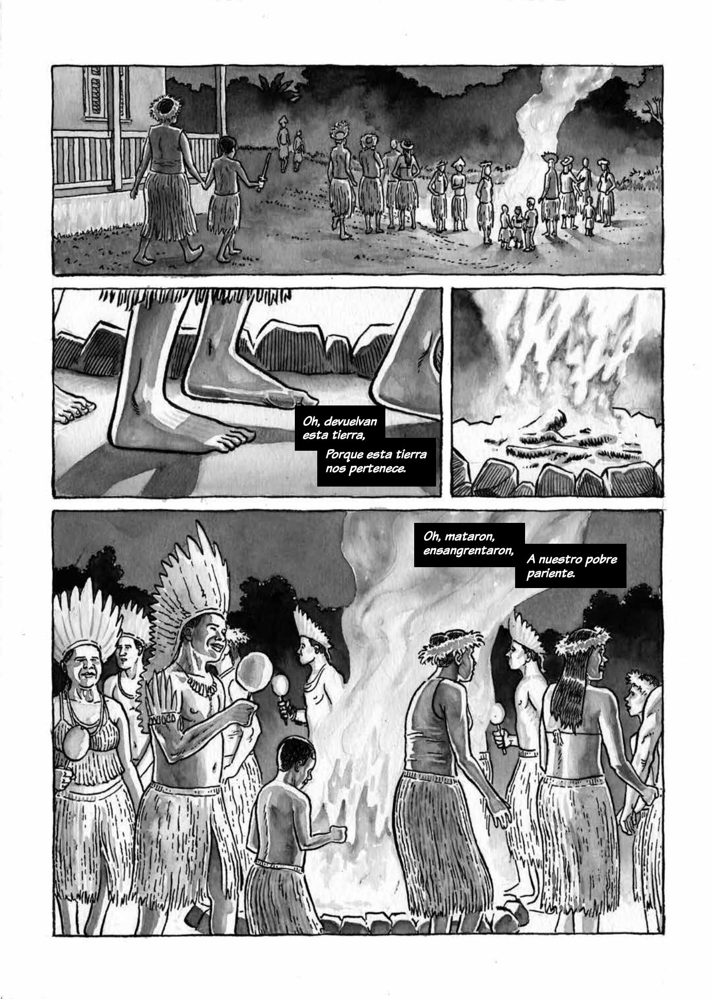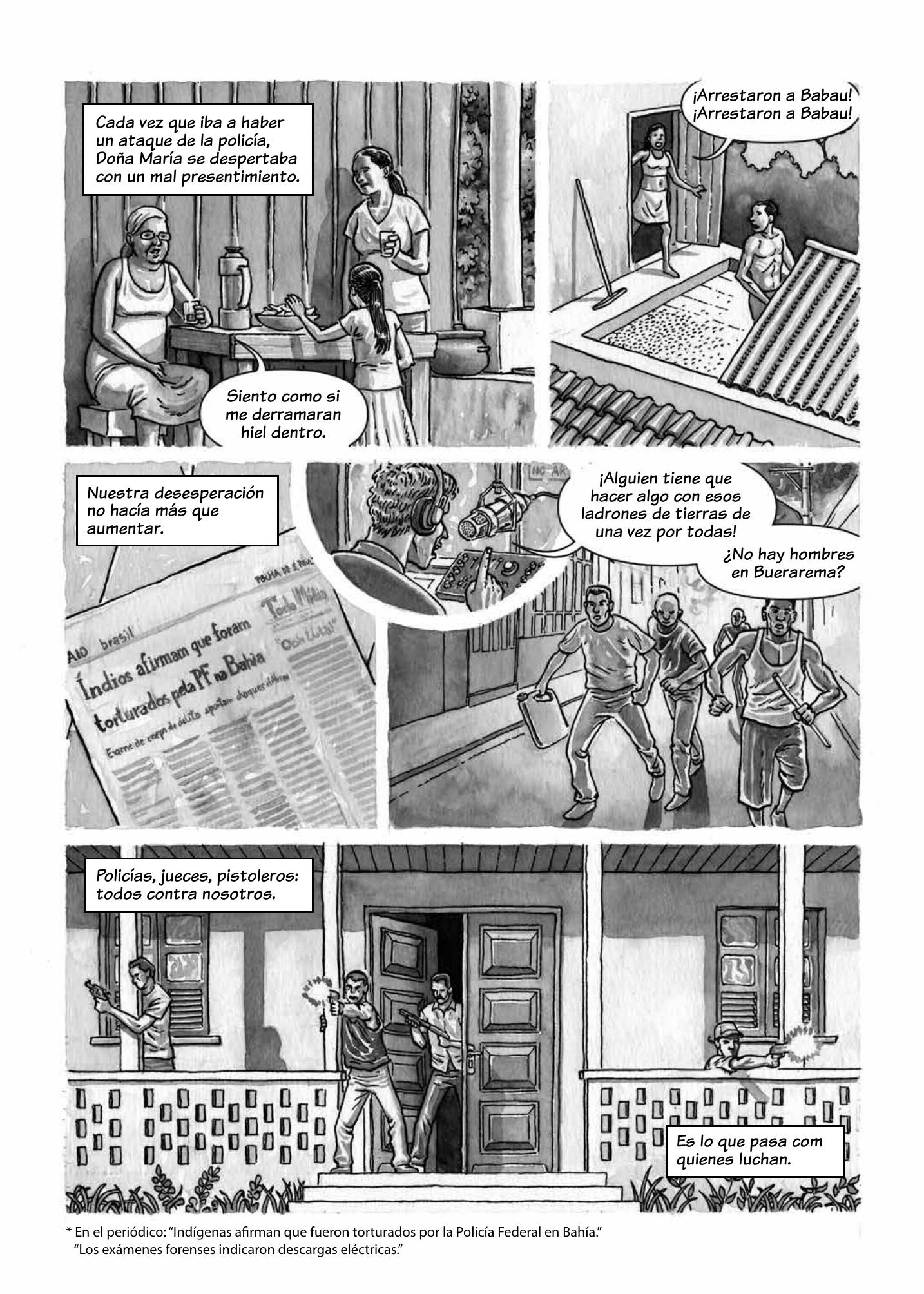 Publicado en 2020, la novela gráfica Los dueños de la tierra presenta siete historias realizadas en acuarela, basadas en narrativas recopiladas entre los Tupinambá de Serra do Padeiro, en el sur de Bahía (Brasil). Estas historias combinan elementos cosmológicos, recuerdos y relatos de acontecimientos históricos y contemporáneos de la lucha de los Tupinambá por defender su territorio. Aquí presentamos una de esas historias, “Recuperación”. Esta investigación fue apoyada por la Asociación Nacional de Acción Indigenista (ANAÍ).