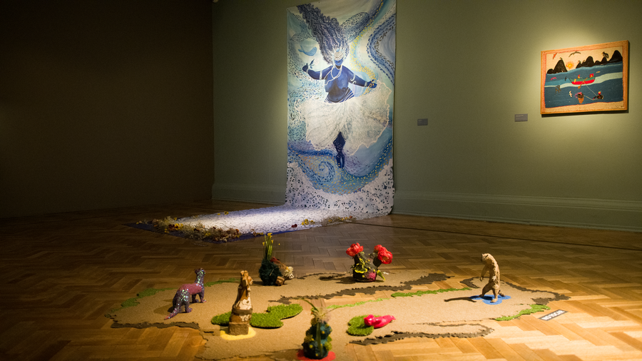 “Sinsiña” é uma instalação concebida especificamente para o espaço, composta por pequenas esculturas dispostas no chão da galeria que evocam uma cartografia simbólica do Chile. Por meio do jogo entre figuras, texturas e materiais orgânicos, a instalação suscita questões sobre a memória, a ancestralidade e o sentimento de pertencimento. Situada sob a imagem de um poderoso espírito feminino da água, a obra conecta corpo e território, mito e paisagem. “Sinsiña” reimagina o espaço nacional não como uma geografia fixa, mas como um terreno vivo moldado pela comunidade, pela narrativa e pela resistência, convidando o espectador a percorrer uma paisagem onde o patrimônio cultural e o mundo natural estão profundamente entrelaçados.