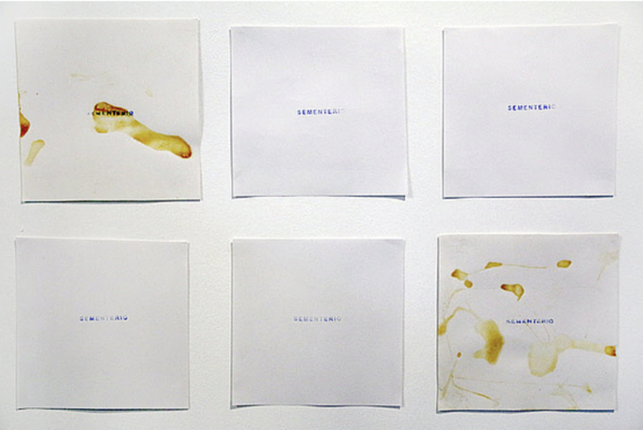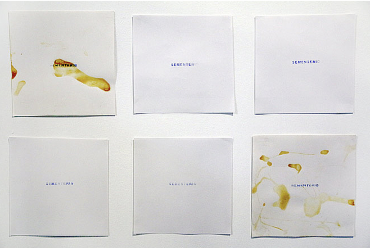 Sementerio é uma série de desenhos abstratos, que misturam tinta de cores e esperma sobre papel, marcas remanescentes de ejaculações, cuja impressão é um registro orgânico do próprio corpo do artista e dos participantes voluntários. Esta obra reflete sobre a existência sexuada, enfatizando na noção de morte, seja pelo desvanecimento pós-orgásmico de si próprio ou pelo vestígio de gametas que contêm o arquivo genético como terra fértil para outras possíveis vidas. Esta obra foi realizada nos momentos mais complexos de contágio de HIV nos que imperava a paranoia, a dúvida e a desinformação.