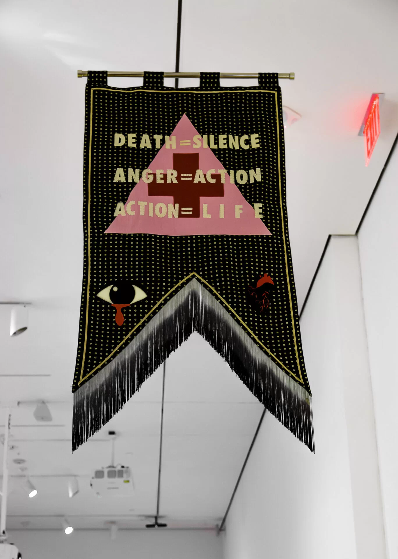 Signo de protesta é uma série de estandartes, objetos e adereços que funcionam como ferramentas de teoria política, arte e ativismo. Este estandarte em particular foi produzido no âmbito do 30 aniversário da ‘ACT UP’ [Coalizão da Aids para liberar o poder], e enuncia os lemas “Morte = Silêncio, Fúria = Ação, Ação = Vida”, inseridas no triângulo rosa que representa a comunidade LGBTIQA+. A obra participou de Nadie te prometió un mañana: 50 anos depois de Stonewall (2019), uma exposição realizada em homenagem aos distúrbios de seis dias ocorridos por causa de uma batida policial no bar gay Stonewall em Nova Iorque, em 1969. Historicamente, o movimento foi considerado a primeira ocasião em que a comunidade LGBTIQA+ lutou contra um sistema que perseguia sua dissidência e um momento catalizador dos movimentos pelos direitos de representação.