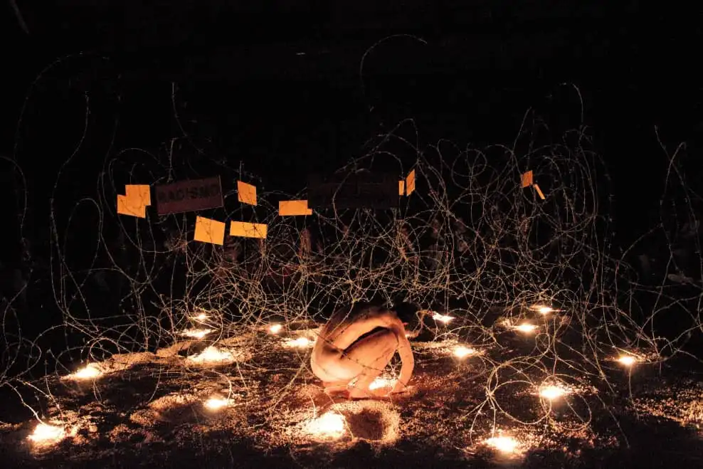 Em Zona de Silencio, o corpo se transforma no meio pelo qual o silĂȘncio, a violĂȘncia e a vulnerabilidade sĂŁo colocados em cena. Criada pelo grupo El Ciervo Encantado e interpretada por Mariela Brito, a obra transforma a sala de teatro experimental em uma paisagem carregada: uma instalação de arame farpado sobre a terra, iluminado tenuemente por lĂąmpadas espalhadas. Durante cinquenta minutos, o corpo nu de Brito se movimenta lenta e silenciosamente ao longo da estrutura ameaçadora, fazendo pausas para escavar e desenterrar palavras como censura, prostituição infantil, racismo e abuso de poder. DistribuĂdos com neutralidade arrepiante, estes fragmentos ativam a imaginação do pĂșblico, forçando-o ao silĂȘncio, a ressoar com o ruido social. Rejeitando os protocolos teatrais tradicionais, a interpretação dissolve as fronteiras do texto, o carĂĄter e o drama, articulando uma prĂĄtica hĂbrida das artes vivas. A Zona de SilĂȘncio, estreada em Cuba em 6 de março, coloca em cena o corpo como veĂculo de resistĂȘncia dentro de um sistema frĂĄgil e perigoso.