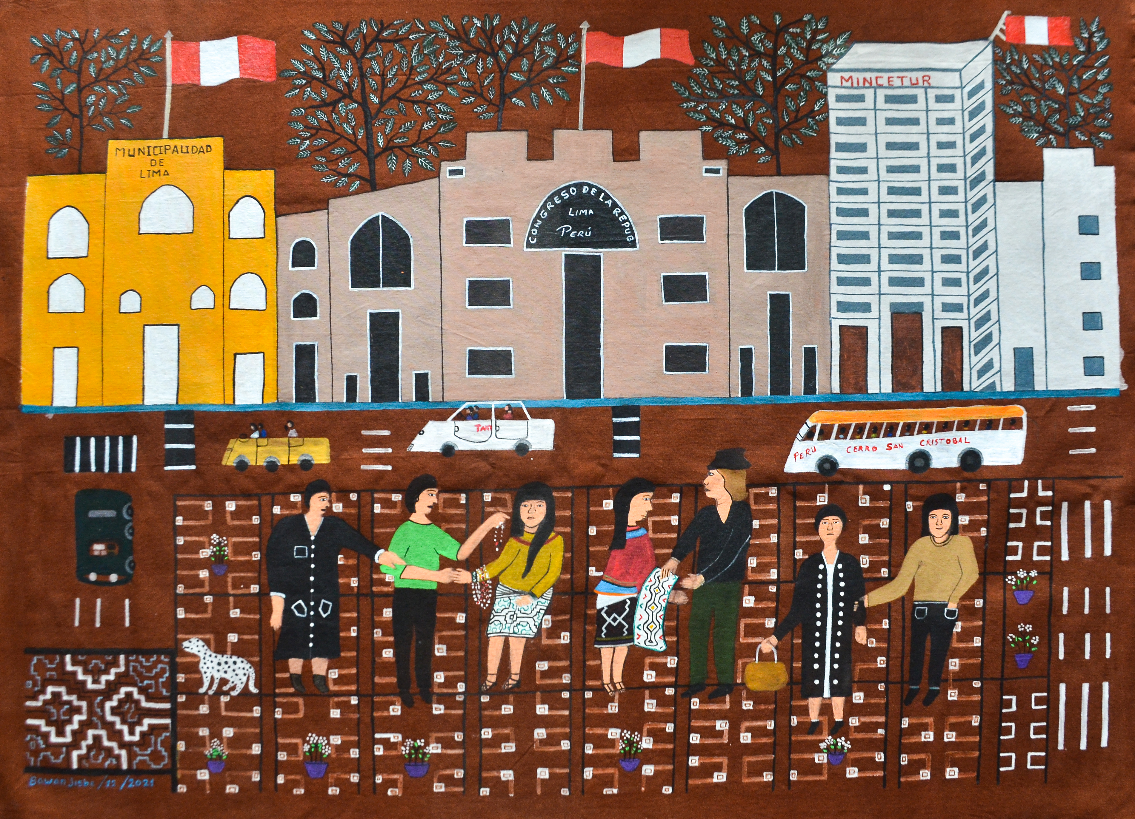 Esta pintura mostra um contraste notável em Lima, onde pessoas shipibas vendem seus artesanatos coloridos em meio de prédios institucionais e em uma avenida ruidosa. Os tons cálidos ressaltam as criações Indígenas, que brilham na paisagem urbana. Esta obra reflete a riqueza cultural em um contexto moderno, enfatizando a importância do patrimônio Indígena.